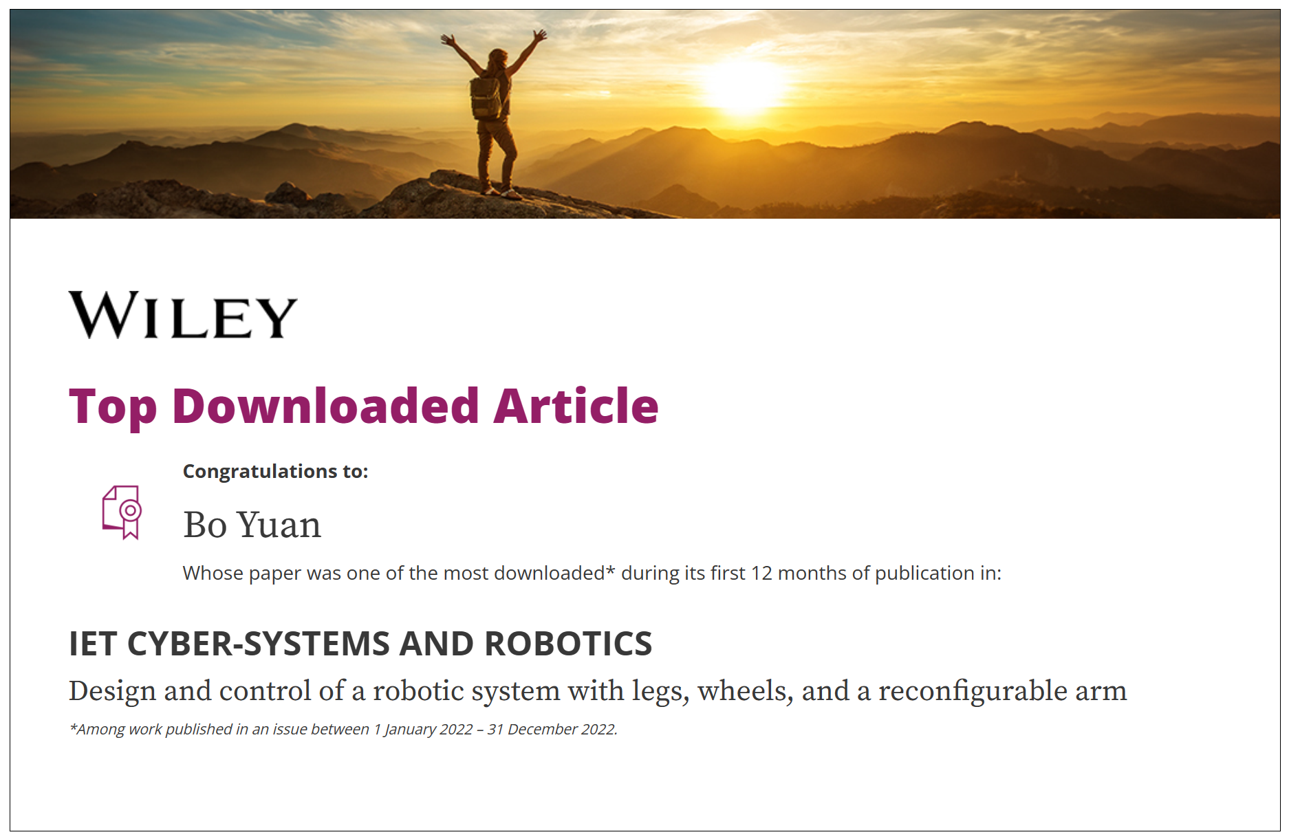Ye, L.Q., Liu, H.D., Wang, X.Q., Liang, B. and Yuan, B. (2022) "Design and Control of a Robotic System with Legs, Wheels, and a Reconfigurable Arm". IET Cyber-Systems and Robotics, vol. 4(4), Wiley, pp. 313-321. doi: 10.1049/csy2.12072 Wiley Top Downloaded Article