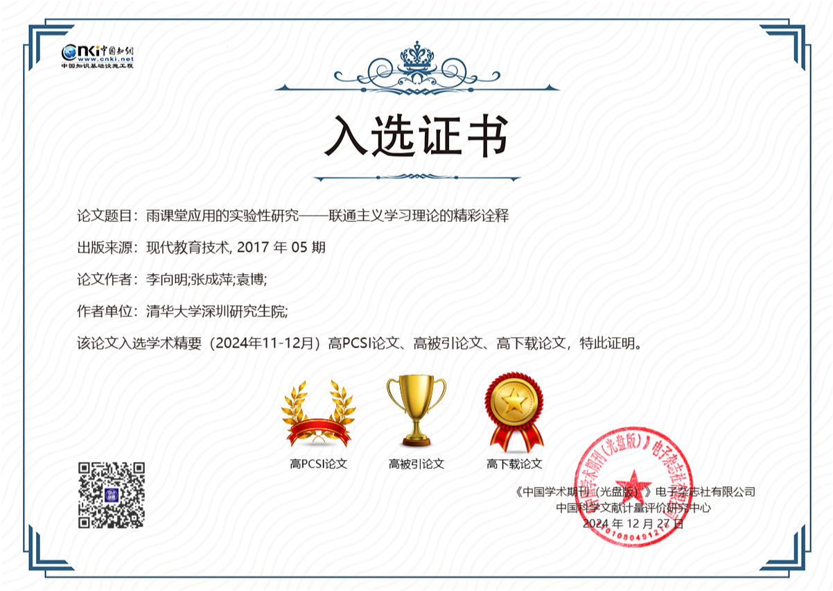 Li, X.M., Zhang, C.P. and Yuan, B. (2017) "An Experimental Study on the Application of Rain Classroom—Elucidating the Fundamental Rules of the Connectivism Learning Theory". Modern Educational Technology, vol. 27(5), pp. 40 – 45. doi.10.3969/j.issn.1009-8097.2017.05.006 CSSCI Certificate