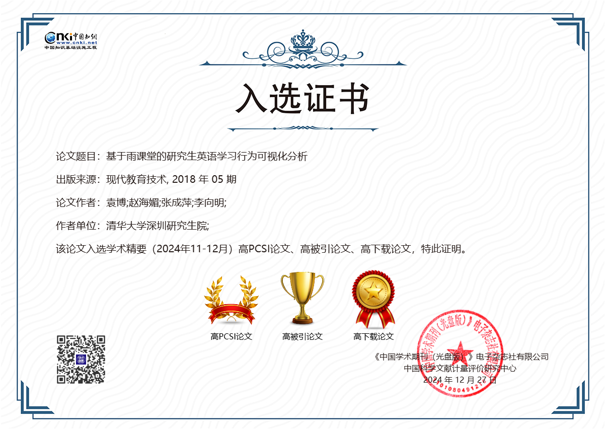 Yuan, B., Zhao, H.M., Zhang, C.P. and Li, X.M. (2018) "Visual Analysis of Postgraduate English Learners Based on Rain Classroom". Modern Educational Technology, vol. 28(5), pp. 68-74. doi: 10.3969/j.issn.1009-8097.2018.05.010 CSSCI Certificate
